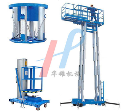 單桅鋁合金升降機是由單桅柱支撐作業平臺,是起初出現的鋁合金升降機。具有升降平衡,操作方便等優點能,可隨意進出電梯且耗電少、無污染、工作時不傷 地面,可用于貼墻工作及探出作業,工作無死角等優點。雙桅鋁合金升降機整體采用高強度鋁型材精制而成由于型材強度高,使升降臺的偏轉與擺動極小。采用雙桅柱式結構,載重量大,平臺面積大,穩定性極好,運轉靈活,推行方便。 三桅鋁合金升降機由三組桅柱支撐作業平臺同步升降,支腿結構同單桅柱式平臺,具有超大的載重量和優秀的工作穩定性。四桅鋁合金升降機整體采用高強度鋁型材精制而成由于型材強度高,采用四桅柱式結構,穩定性極好,運轉靈活,載重量大,平臺面積大,推行更方便。